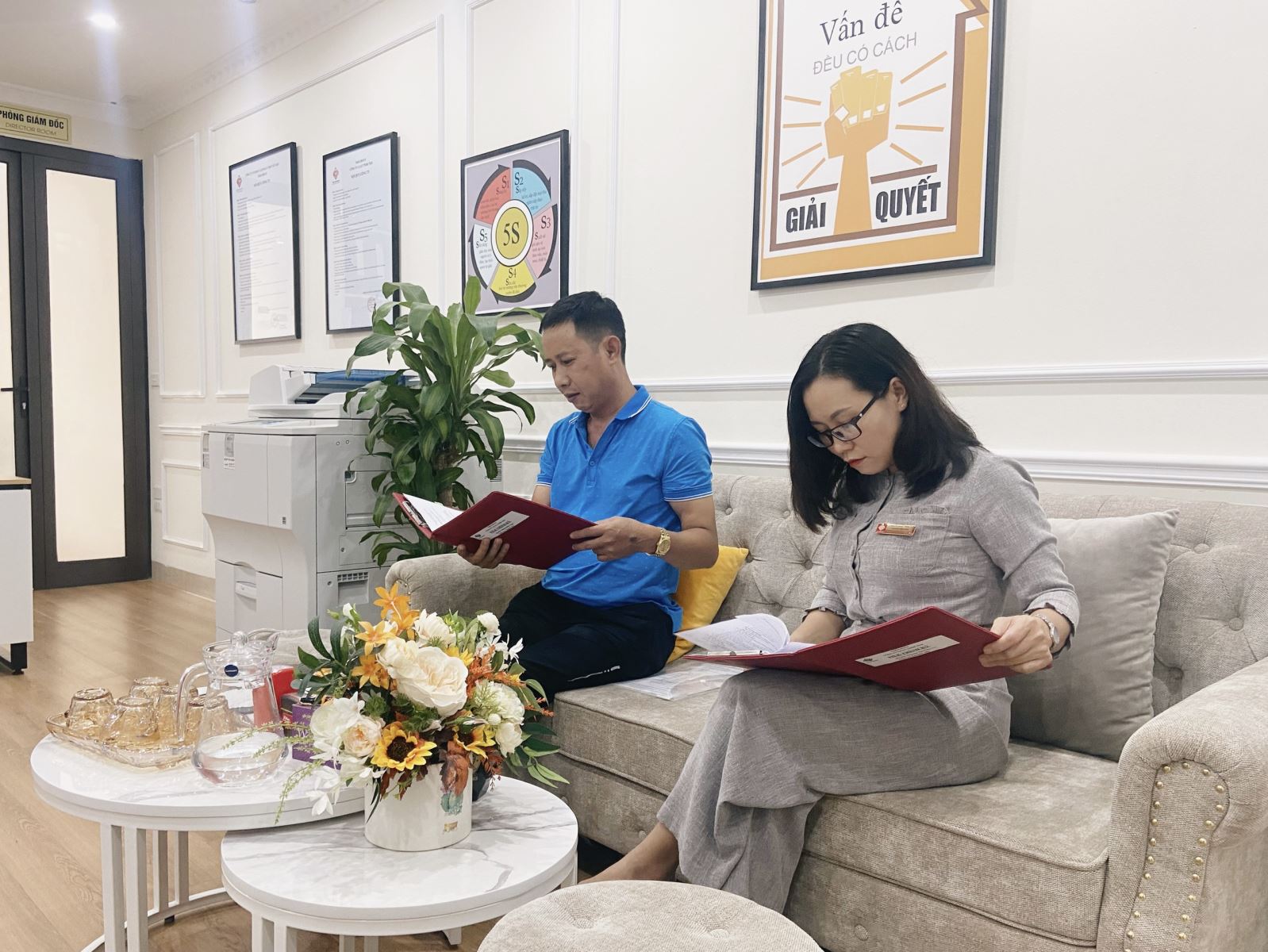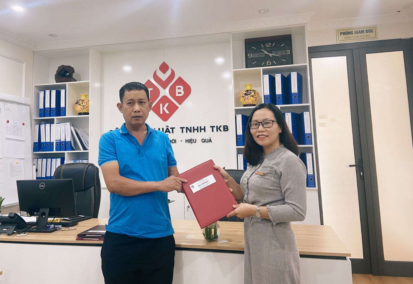Ông Nguyễn Đức Điệp - Giám đốc Công ty TNHH Sản xuất và Thương mại Thực phẩm Điệp Nho và Luật sư Nguyễn Thị Thủy - Giám đốc Công ty Luật TNHH TKB trao đổi về việc ký kết Hợp đồng dịch vụ pháp lý.