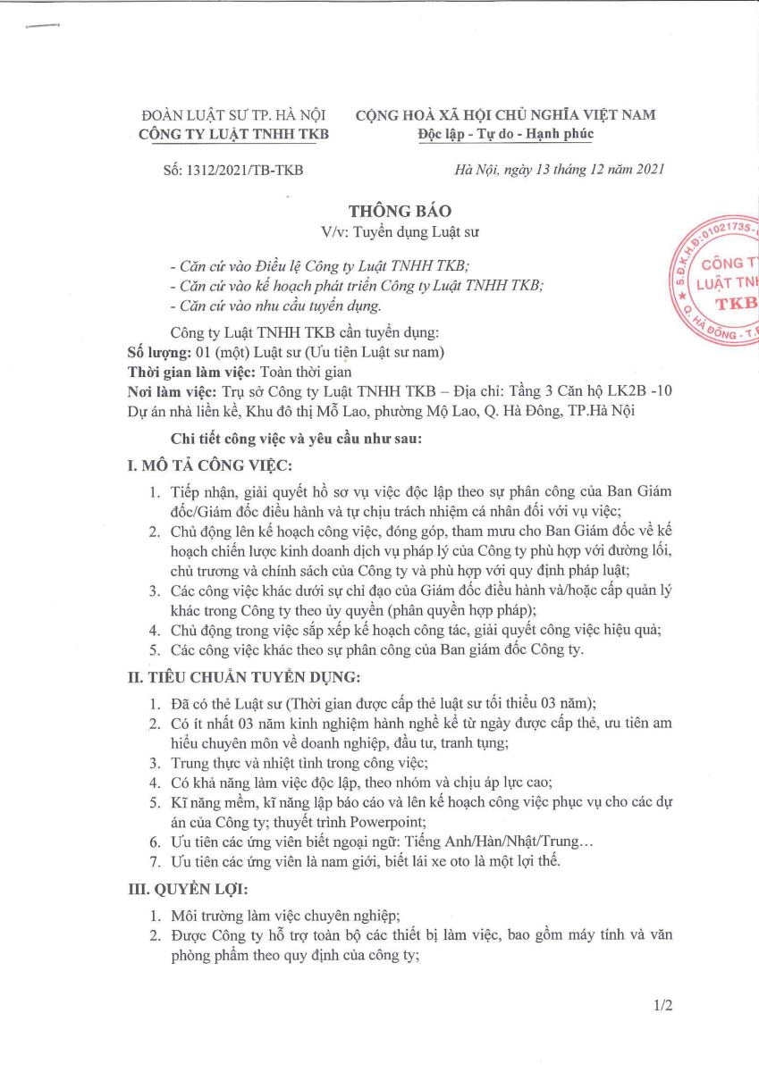 Công ty Luật TNHH TKB tuyển dụng Luật sư, chi tiết về nội dung công việc được nêu trong ảnh đính kèm:
